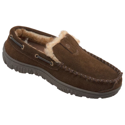 These comfortable suede moccasin slippers are warm and cozy with an outsole that allows for outdoor use as well.